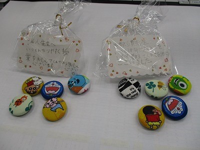 2022年7月20日 19時33分今日は10組の生徒が生活単元学習の時間を使って作成した「くるみボタンのマグネット」を紹介します。様々な布で、くるみボタンを作り、そこにマグネットをはりつけ、ひとつひとつ違ったかわいらしい「くるみボタンのマグネット」を作成しました。できあがった「くるみボタンのマグネット」は教室掲示に使ったり、1学期の授業等でお世話になった先生方に感謝の気持ちをメッセージに書いてプレゼンしたりしました。先生方もとてもうれしそうでした。プレゼントしてくれた作品は職員室のホワイトボードや掲示板等に活用しています。10組の皆さんありがとうございました。
