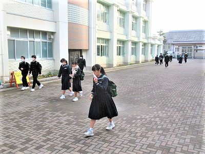 2021年12月10日 15時10分2学期も残りわずかとなりました。朝、昇降口は登校する生徒が歩いています。今日は2学年の家庭学習用のテキストを業者の方から受け取っていました。その後生徒は下駄箱で登校を出迎える教員に挨拶をしながら教室に向かいます。そして教室前では石鹸で手を洗い、健康観察を担任と行いながら自分の教室に入ります。
